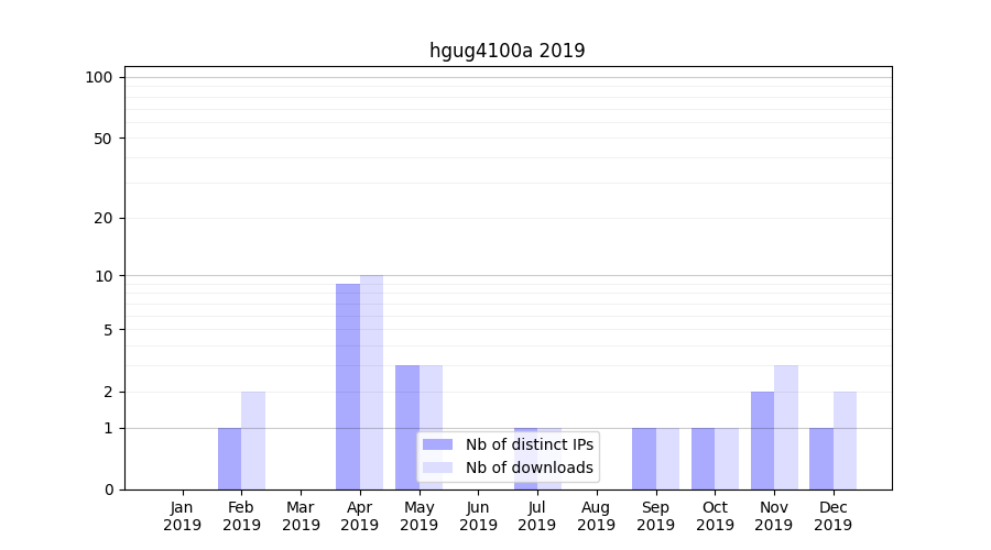 Number of downloads for annotation package hgug4100a, year by year, from 2025 back to 2014 (years with no downloads are omitted):