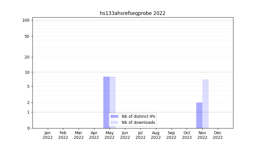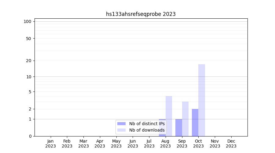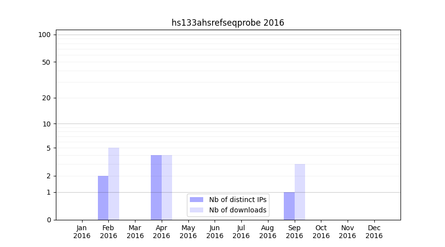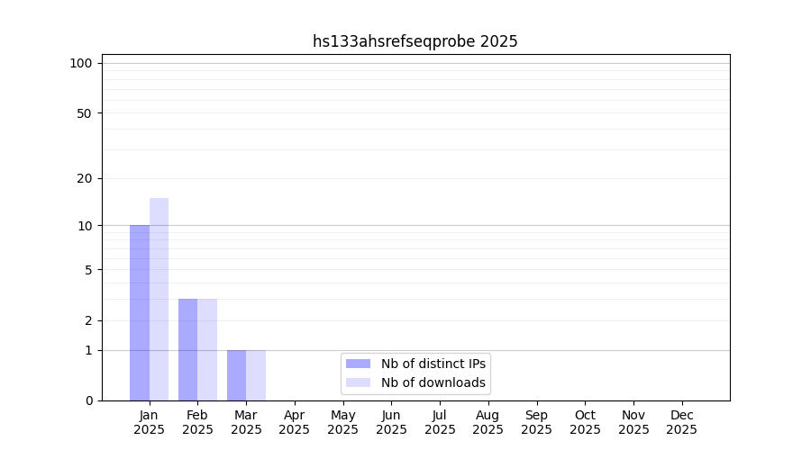 Number of downloads for annotation package hs133ahsrefseqprobe, year by year, from 2025 back to 2014 (years with no downloads are omitted):