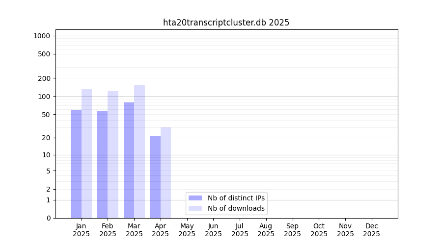 Number of downloads for annotation package hta20transcriptcluster.db, year by year, from 2025 back to 2014 (years with no downloads are omitted):