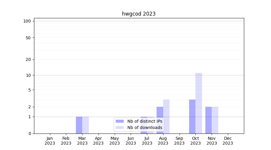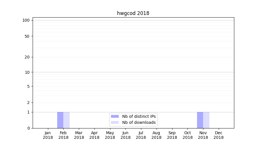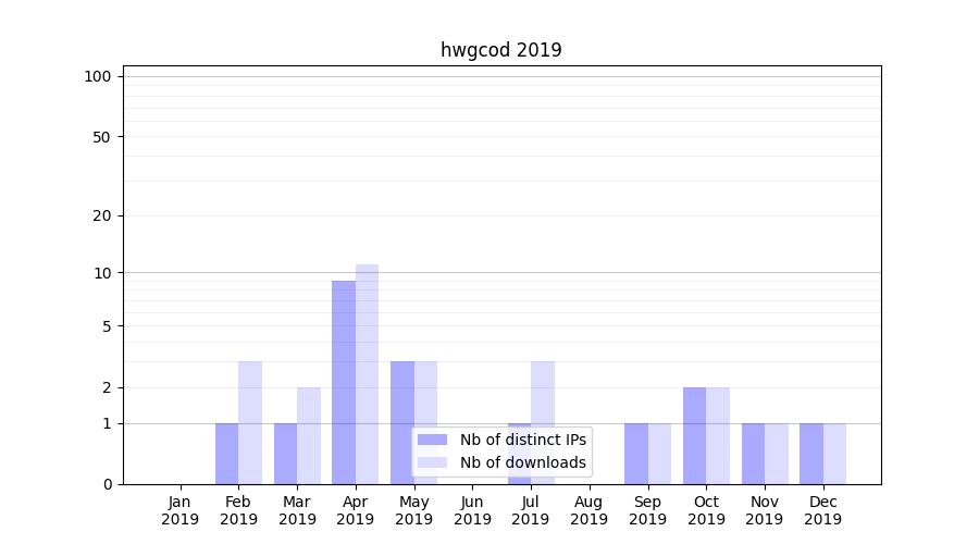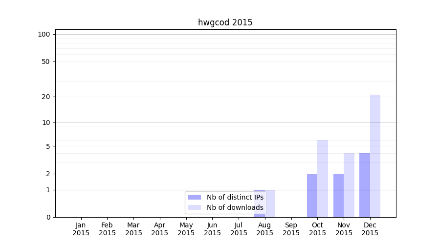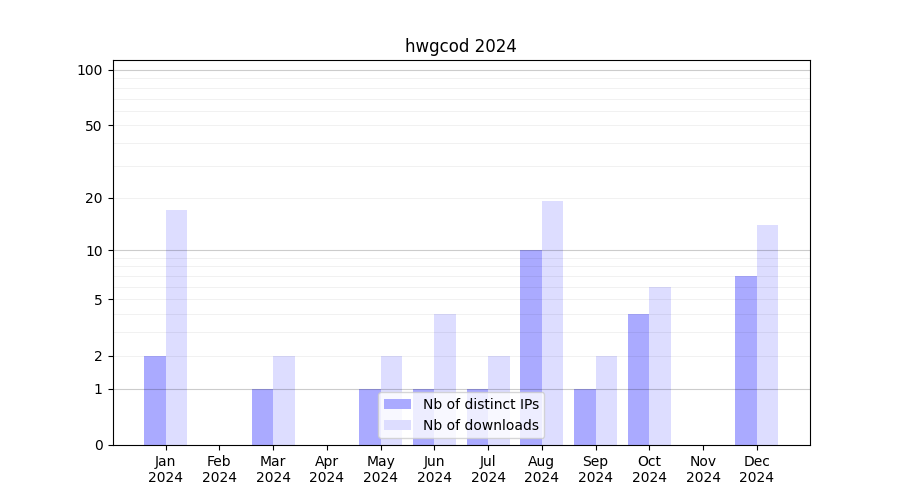 Number of downloads for annotation package hwgcod, year by year, from 2025 back to 2014 (years with no downloads are omitted):