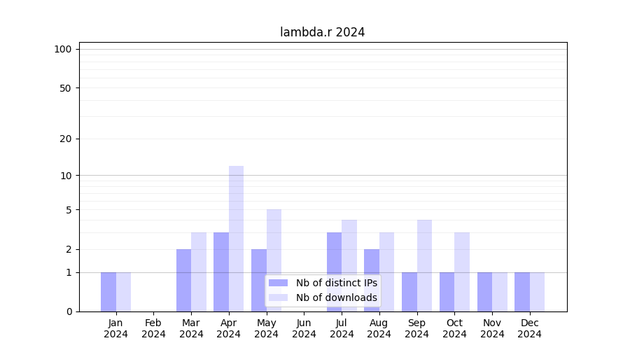 Number of downloads for annotation package lambda.r, year by year, from 2025 back to 2014 (years with no downloads are omitted):