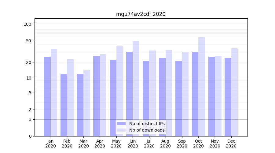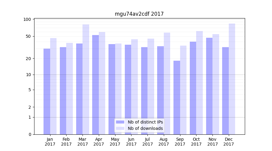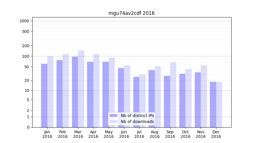 Number of downloads for annotation package mgu74av2cdf, year by year, from 2025 back to 2014 (years with no downloads are omitted):