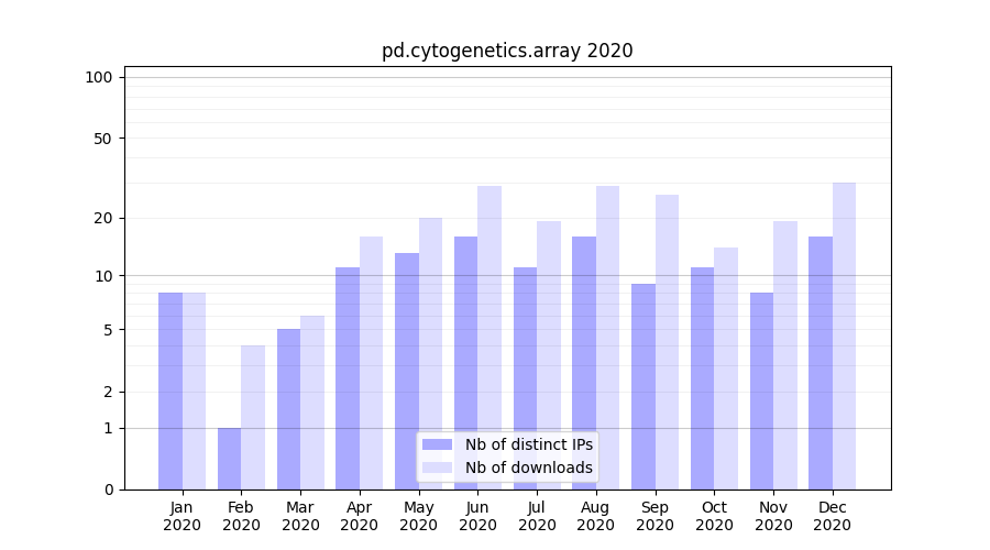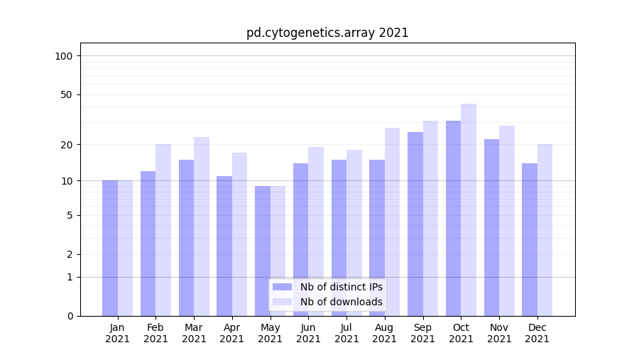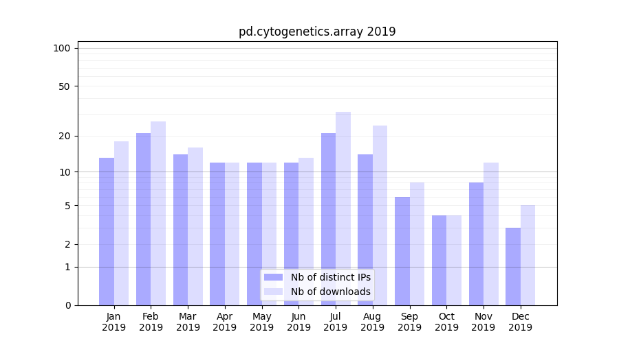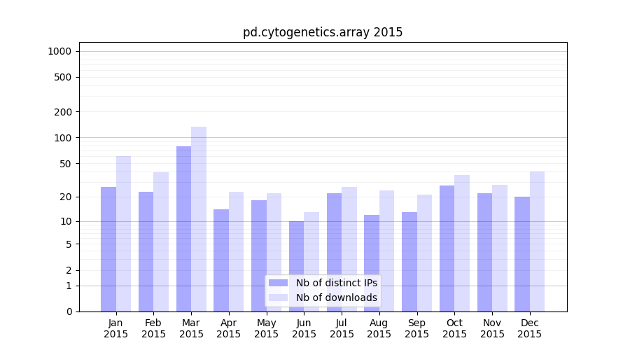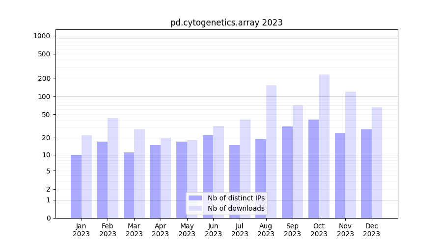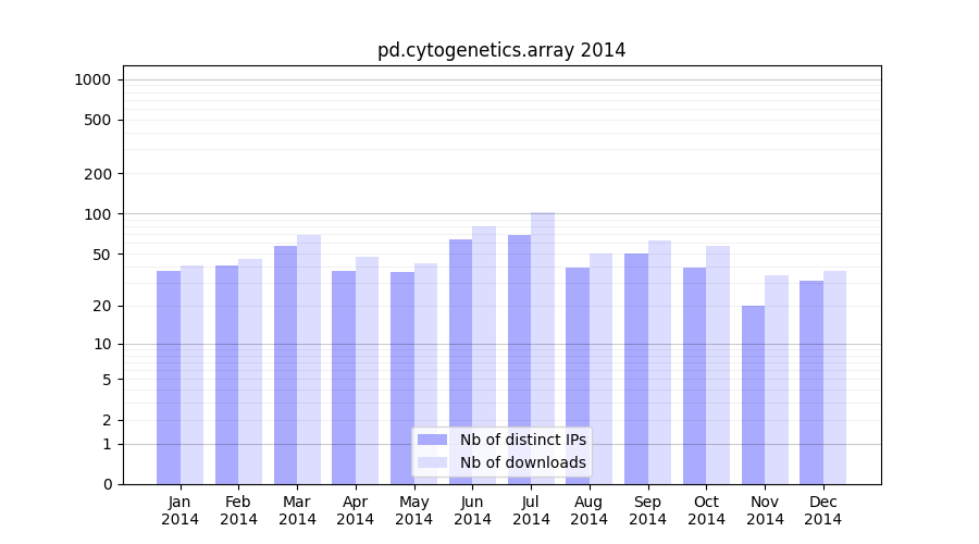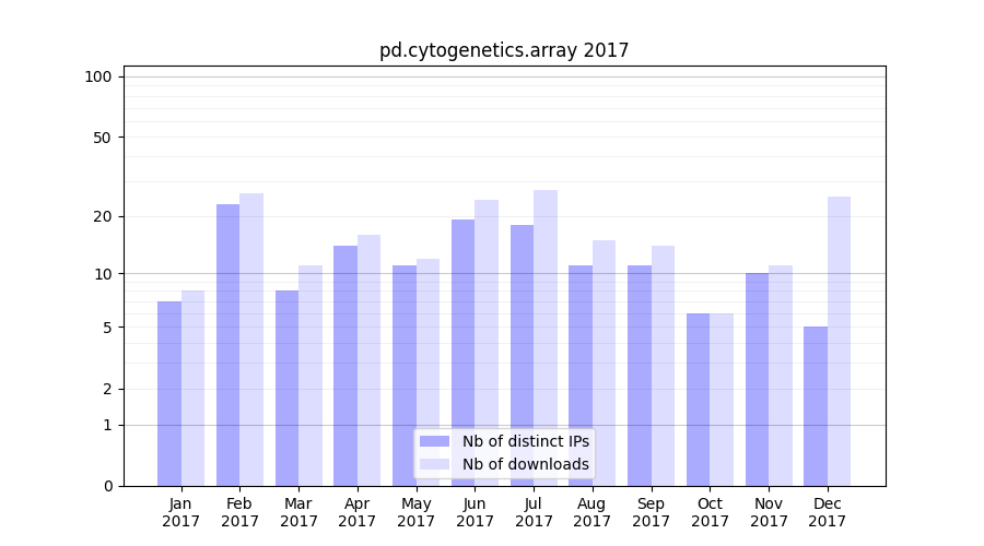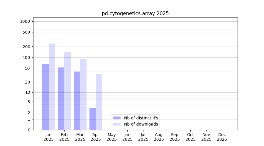 Number of downloads for annotation package pd.cytogenetics.array, year by year, from 2025 back to 2014 (years with no downloads are omitted):