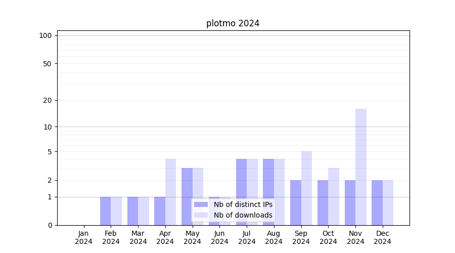 Number of downloads for annotation package plotmo, year by year, from 2025 back to 2014 (years with no downloads are omitted):