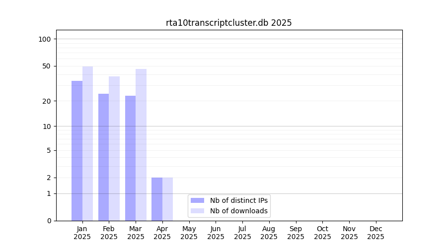 Number of downloads for annotation package rta10transcriptcluster.db, year by year, from 2025 back to 2014 (years with no downloads are omitted):