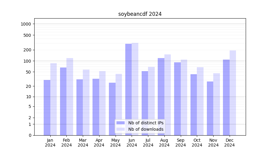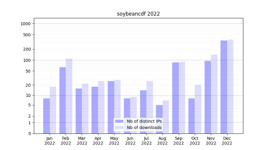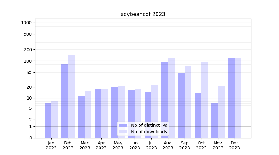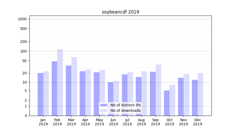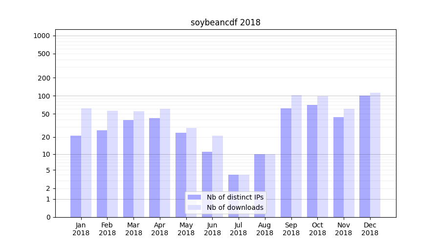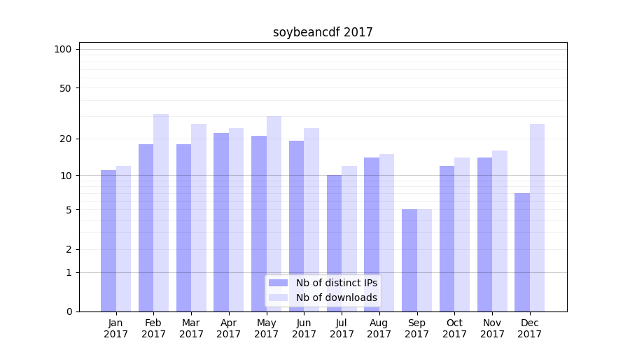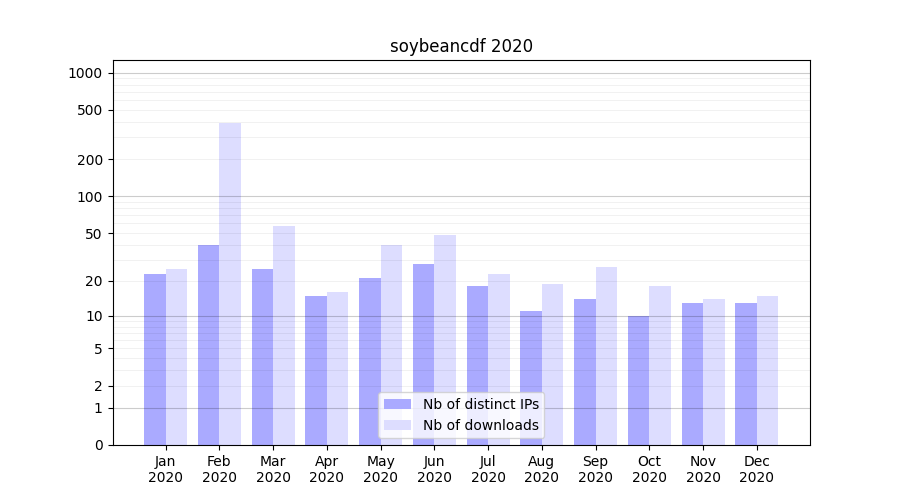Number of downloads for annotation package soybeancdf, year by year, from 2025 back to 2014 (years with no downloads are omitted):