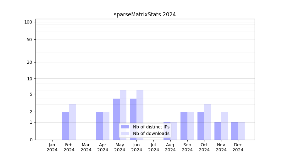 Number of downloads for annotation package sparseMatrixStats, year by year, from 2025 back to 2014 (years with no downloads are omitted):