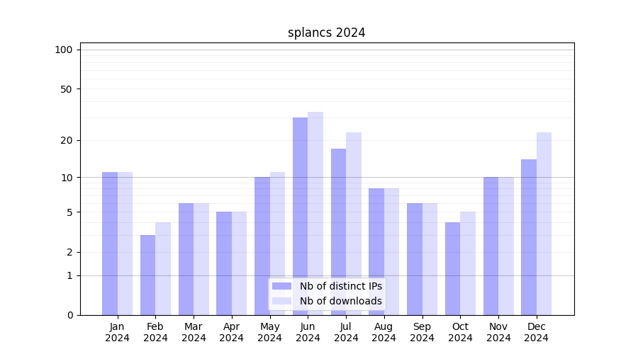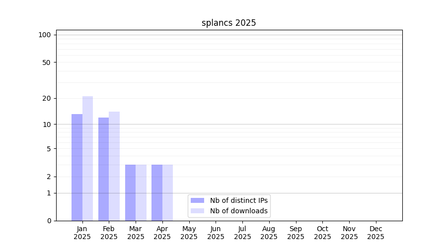 Number of downloads for annotation package splancs, year by year, from 2025 back to 2014 (years with no downloads are omitted):