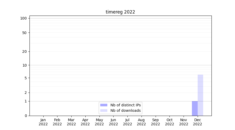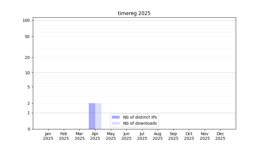Number of downloads for annotation package timereg, year by year, from 2025 back to 2014 (years with no downloads are omitted):