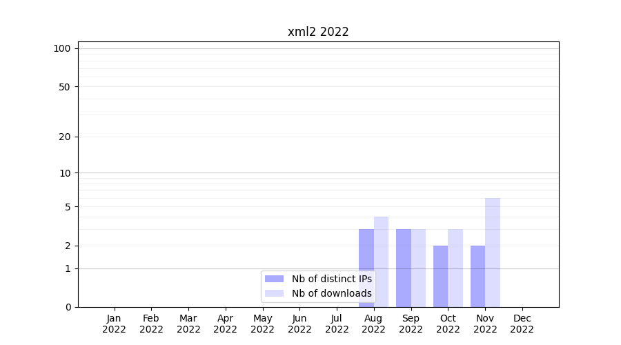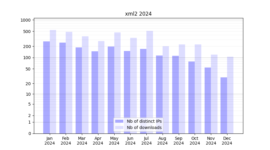 Number of downloads for annotation package xml2, year by year, from 2025 back to 2014 (years with no downloads are omitted):