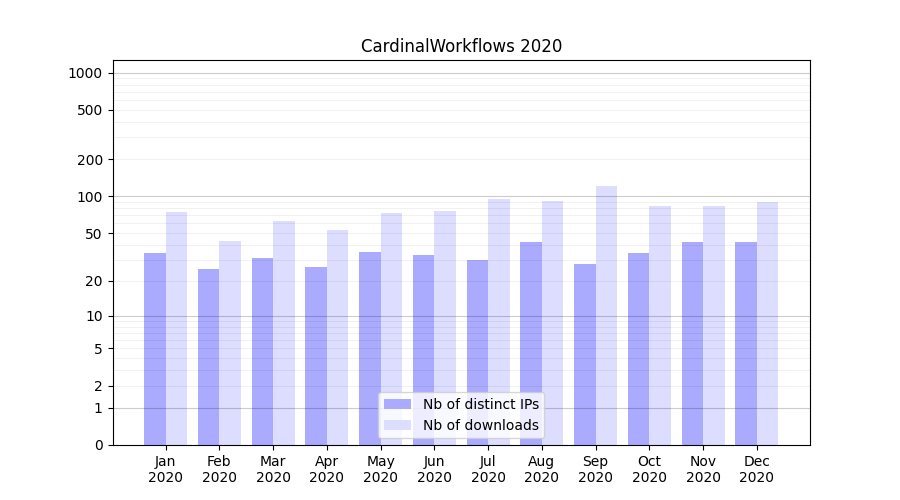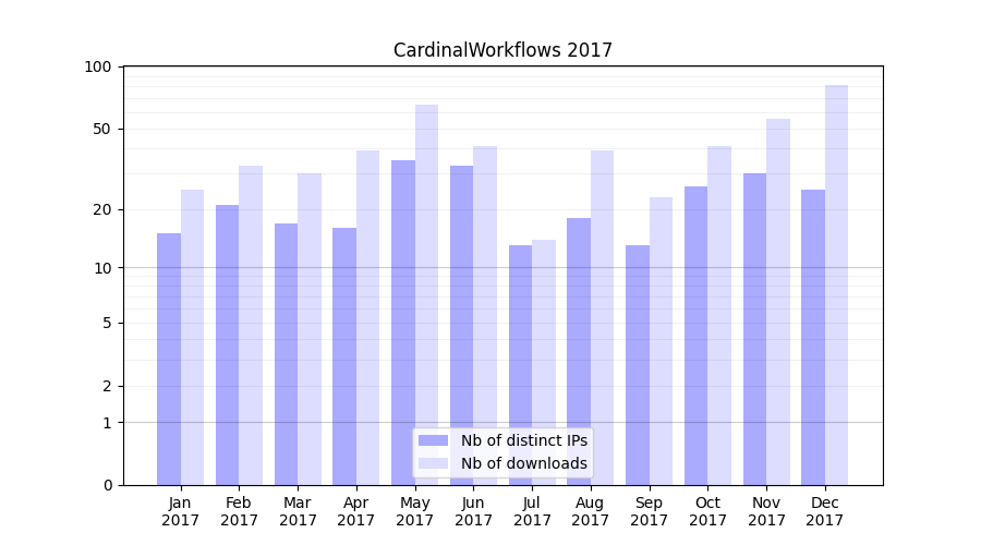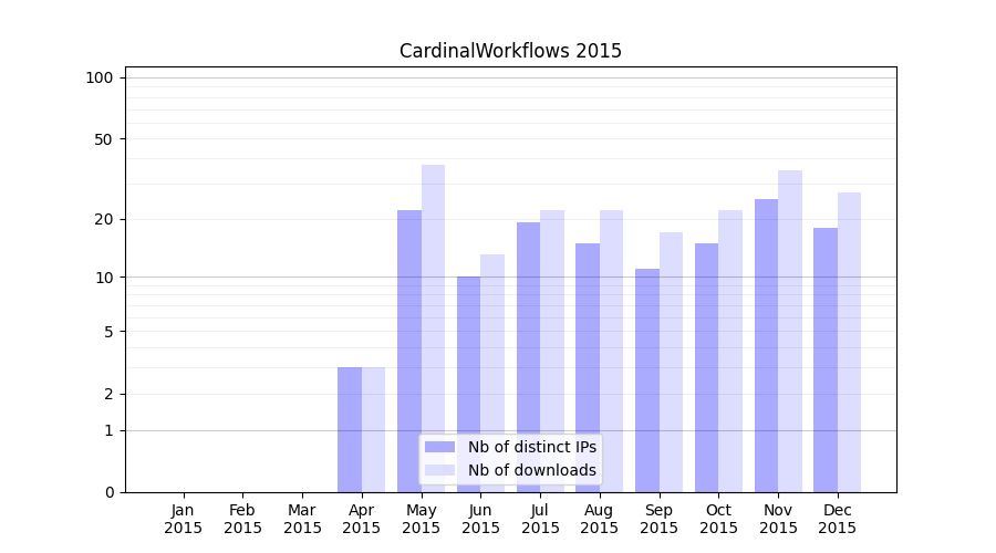 Number of downloads for experiment package CardinalWorkflows, year by year, from 2025 back to 2014 (years with no downloads are omitted):