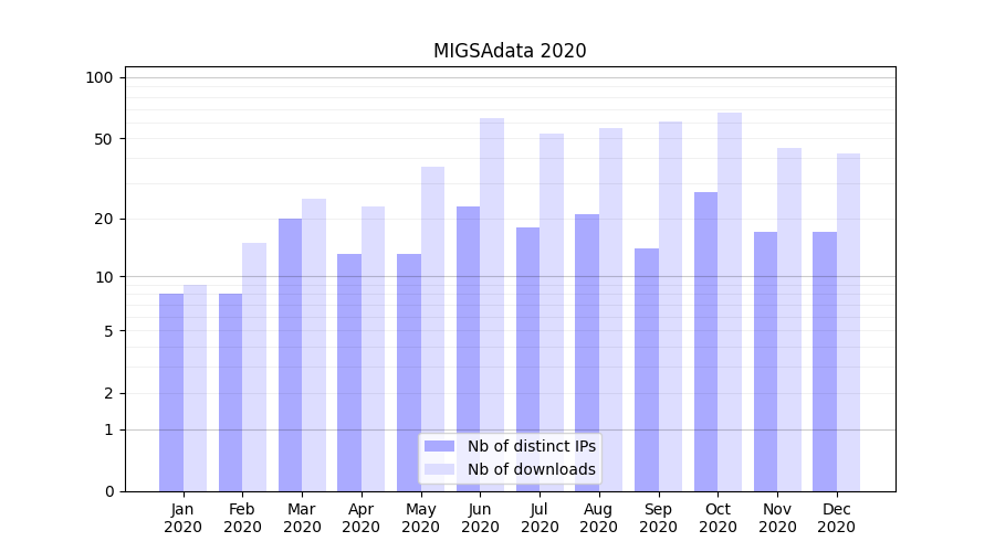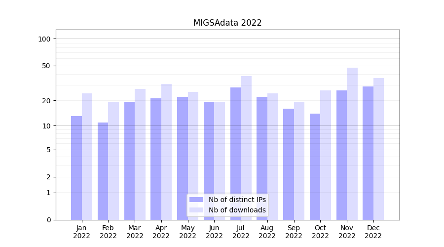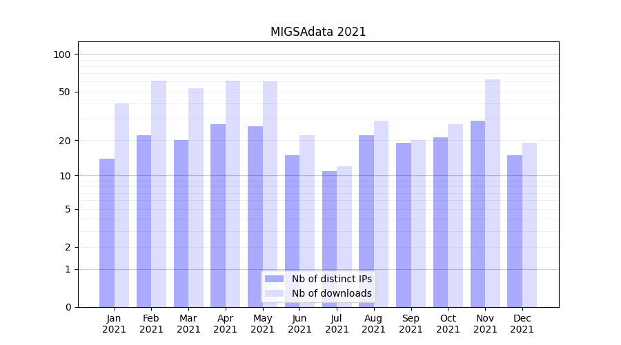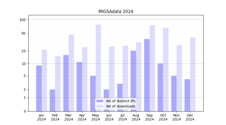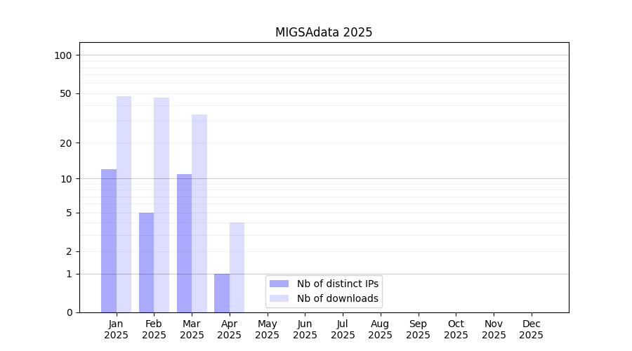 Number of downloads for experiment package MIGSAdata, year by year, from 2025 back to 2014 (years with no downloads are omitted):