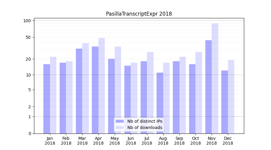 Number of downloads for experiment package PasillaTranscriptExpr, year by year, from 2025 back to 2014 (years with no downloads are omitted):