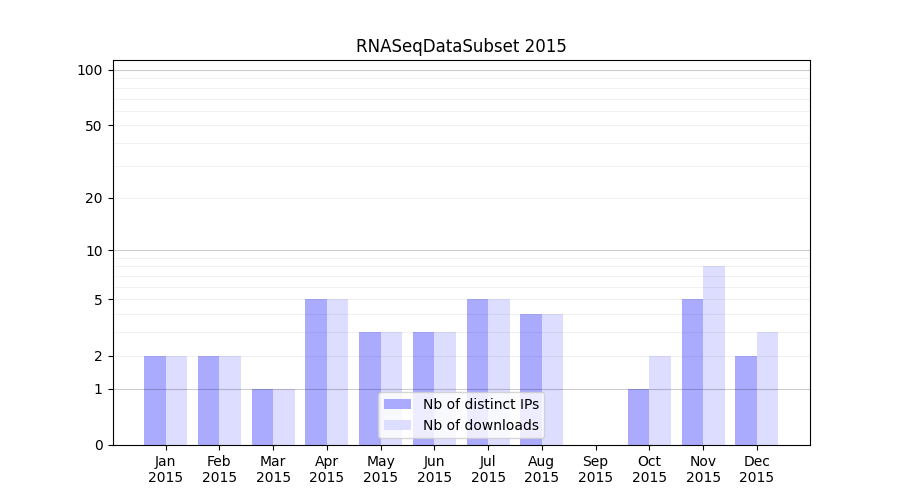 Number of downloads for experiment package RNASeqDataSubset, year by year, from 2025 back to 2014 (years with no downloads are omitted):
