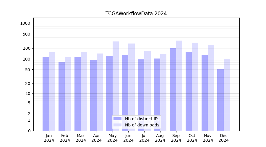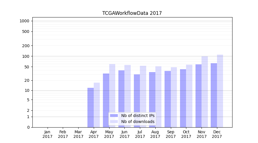 Number of downloads for experiment package TCGAWorkflowData, year by year, from 2025 back to 2014 (years with no downloads are omitted):