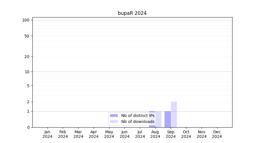 Number of downloads for experiment package bupaR, year by year, from 2025 back to 2014 (years with no downloads are omitted):