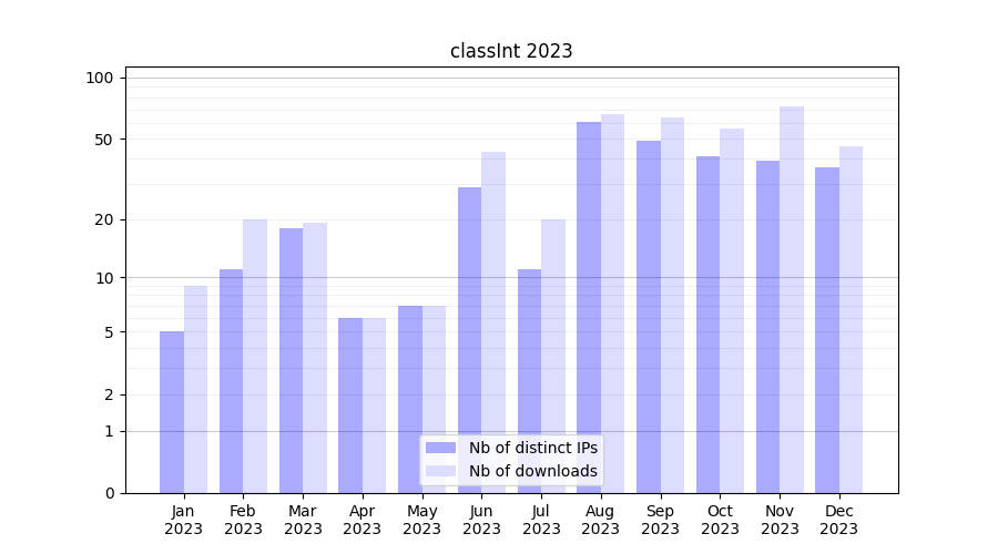 Number of downloads for experiment package classInt, year by year, from 2025 back to 2014 (years with no downloads are omitted):