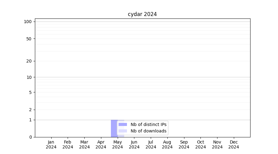 Number of downloads for experiment package cydar, year by year, from 2025 back to 2014 (years with no downloads are omitted):