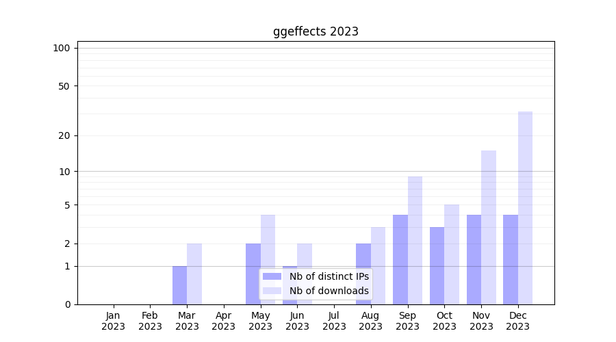 Number of downloads for experiment package ggeffects, year by year, from 2025 back to 2014 (years with no downloads are omitted):