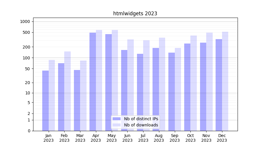 Number of downloads for experiment package htmlwidgets, year by year, from 2025 back to 2014 (years with no downloads are omitted):