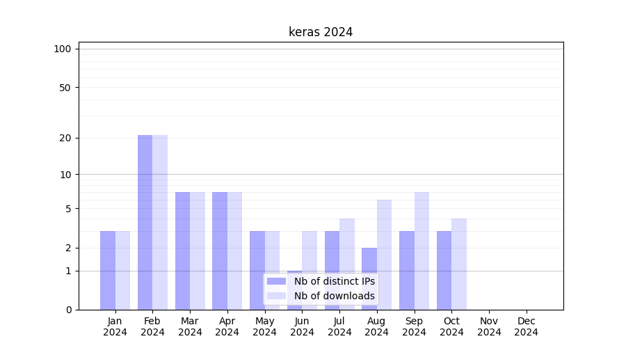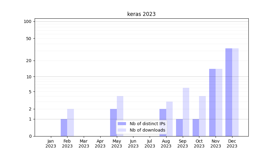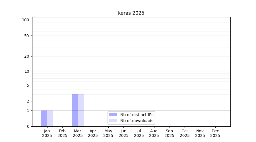 Number of downloads for experiment package keras, year by year, from 2025 back to 2014 (years with no downloads are omitted):