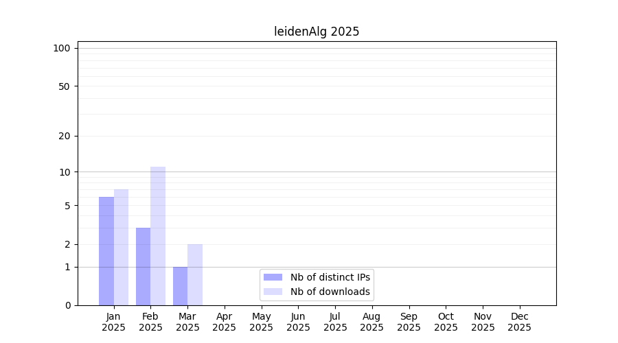Number of downloads for experiment package leidenAlg, year by year, from 2025 back to 2014 (years with no downloads are omitted):