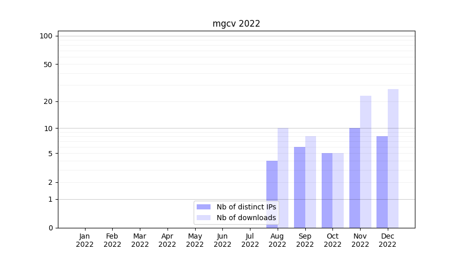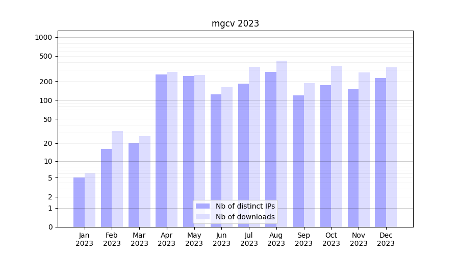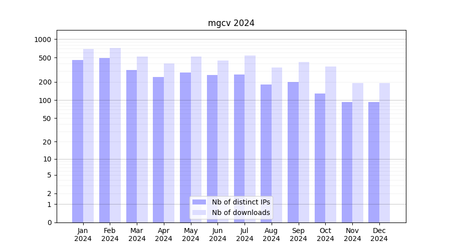 Number of downloads for experiment package mgcv, year by year, from 2025 back to 2014 (years with no downloads are omitted):