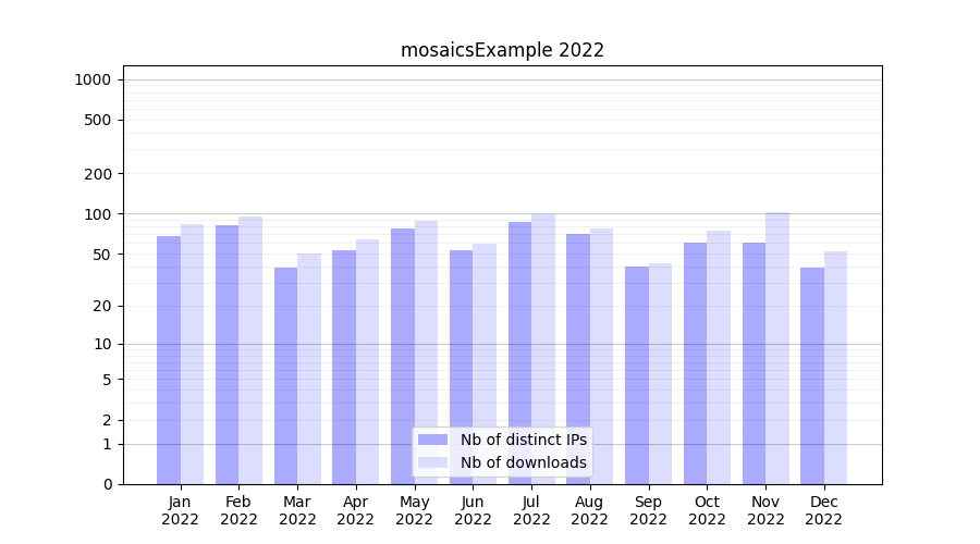 Number of downloads for experiment package mosaicsExample, year by year, from 2025 back to 2014 (years with no downloads are omitted):