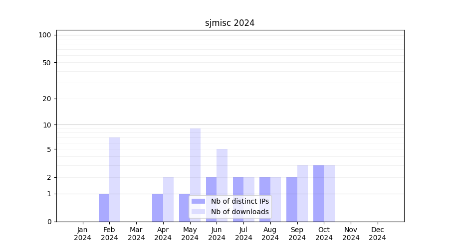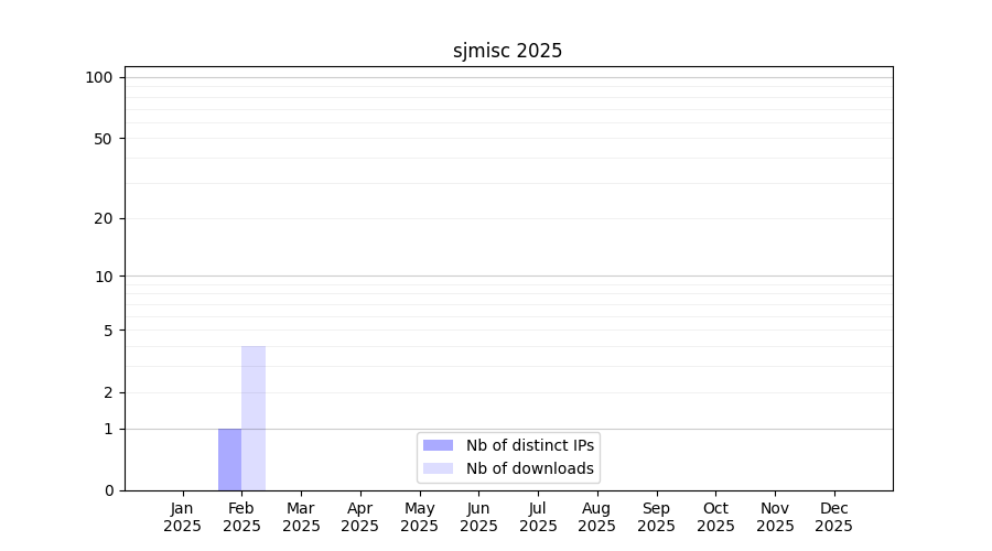 Number of downloads for experiment package sjmisc, year by year, from 2025 back to 2014 (years with no downloads are omitted):