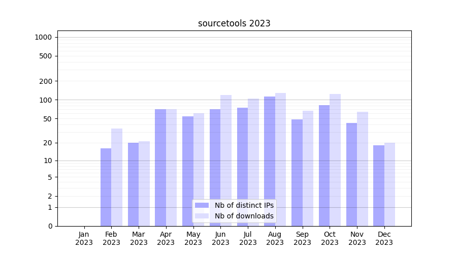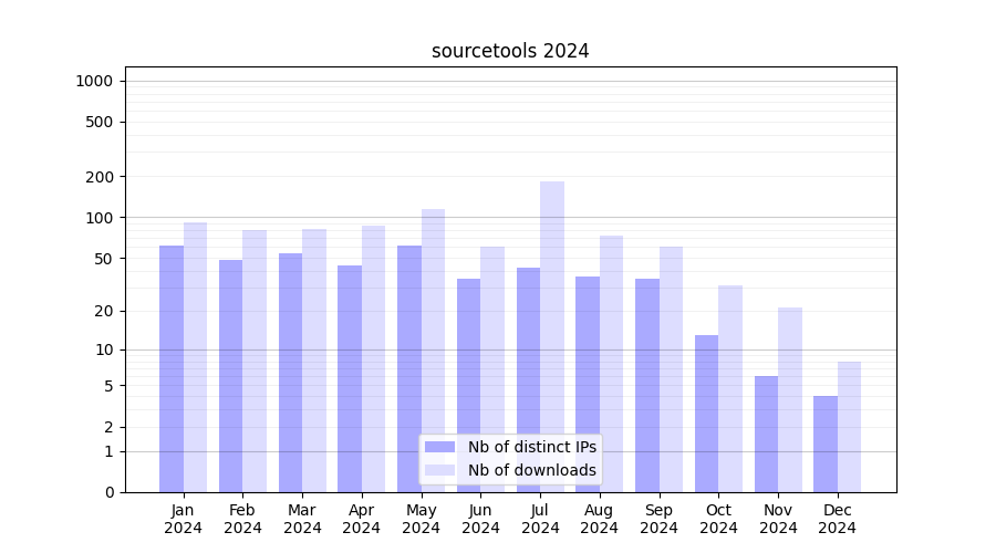 Number of downloads for experiment package sourcetools, year by year, from 2025 back to 2014 (years with no downloads are omitted):
