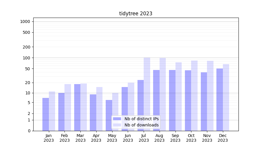 Number of downloads for experiment package tidytree, year by year, from 2025 back to 2014 (years with no downloads are omitted):