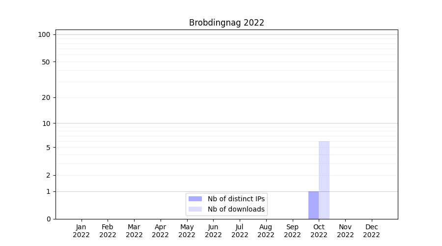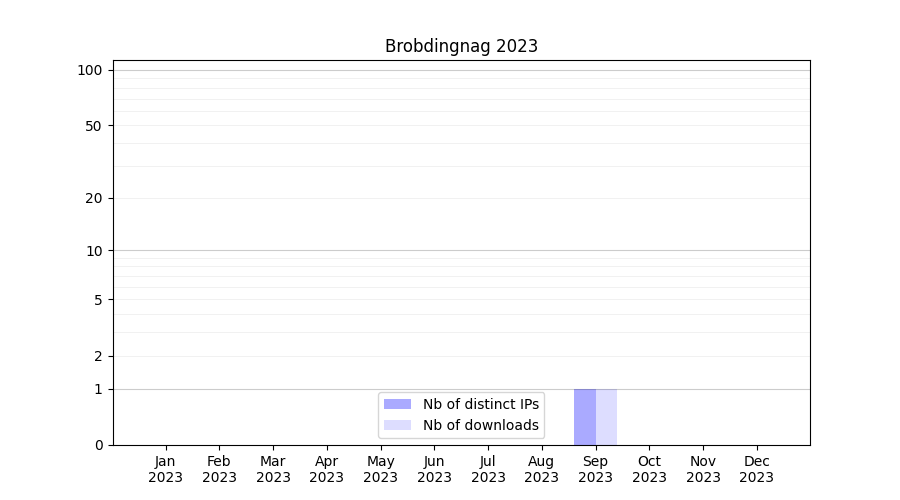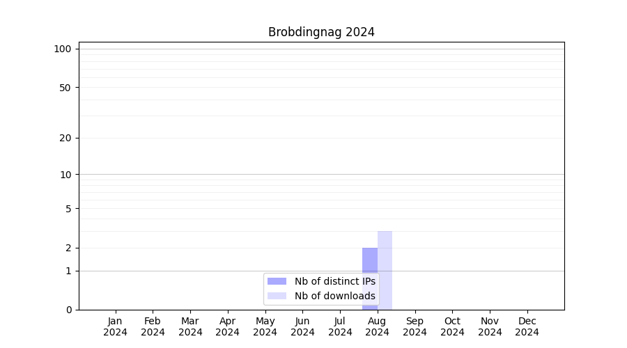 Number of downloads for workflow package Brobdingnag, year by year, from 2025 back to 2015 (years with no downloads are omitted):
