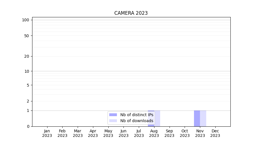 Number of downloads for workflow package CAMERA, year by year, from 2025 back to 2015 (years with no downloads are omitted):
