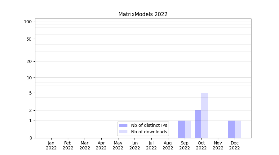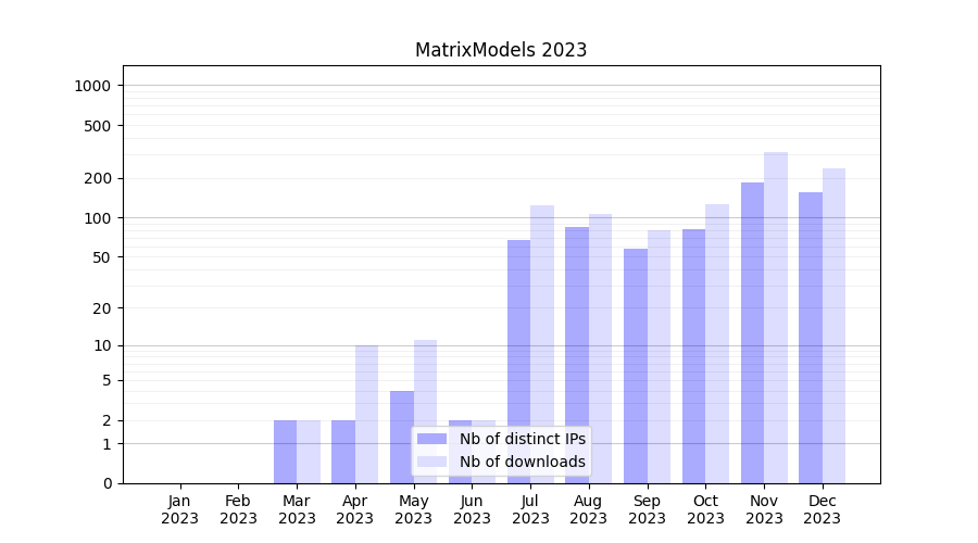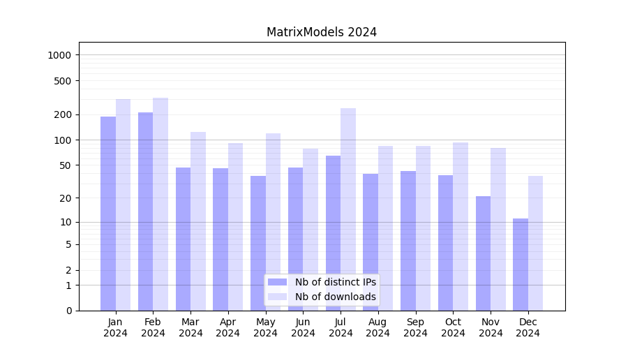Number of downloads for workflow package MatrixModels, year by year, from 2025 back to 2015 (years with no downloads are omitted):