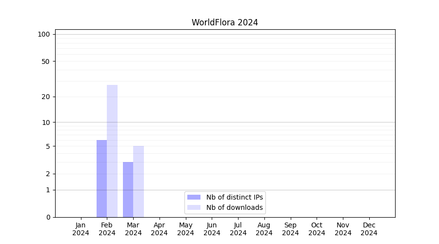 Number of downloads for workflow package WorldFlora, year by year, from 2025 back to 2015 (years with no downloads are omitted):