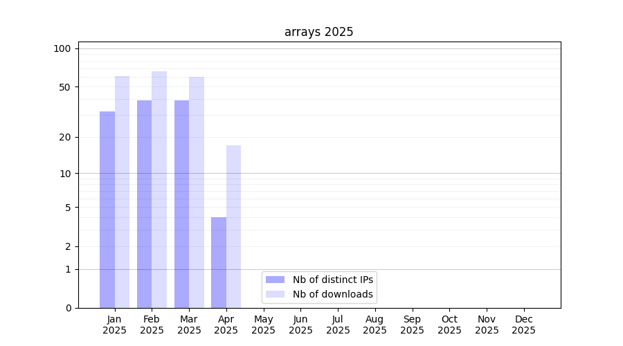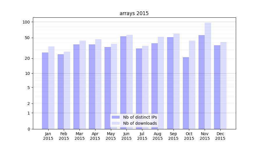 Number of downloads for workflow package arrays, year by year, from 2025 back to 2015 (years with no downloads are omitted):