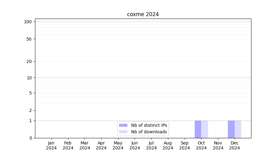 Number of downloads for workflow package coxme, year by year, from 2025 back to 2015 (years with no downloads are omitted):