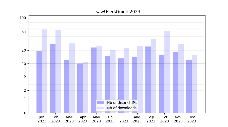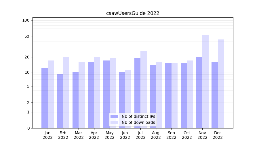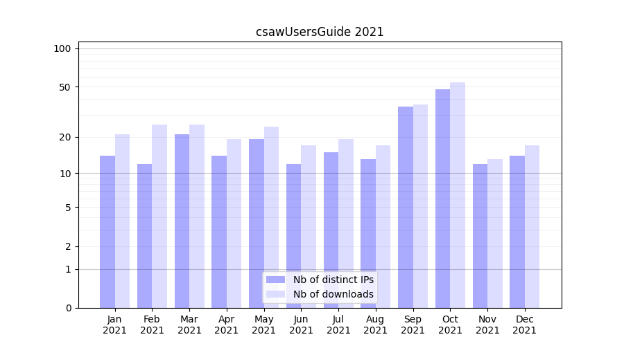 Number of downloads for workflow package csawUsersGuide, year by year, from 2025 back to 2015 (years with no downloads are omitted):
