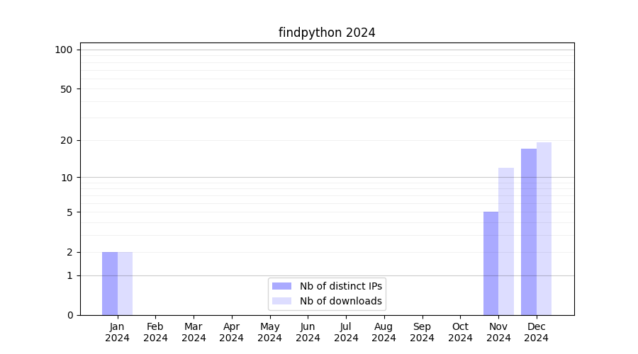 Number of downloads for workflow package findpython, year by year, from 2025 back to 2015 (years with no downloads are omitted):