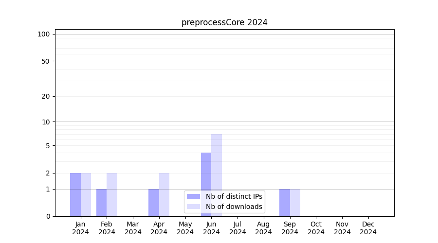 Number of downloads for workflow package preprocessCore, year by year, from 2025 back to 2015 (years with no downloads are omitted):