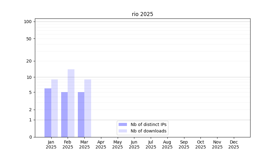Number of downloads for workflow package rio, year by year, from 2025 back to 2015 (years with no downloads are omitted):