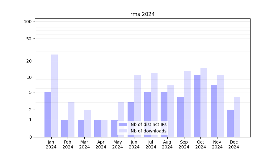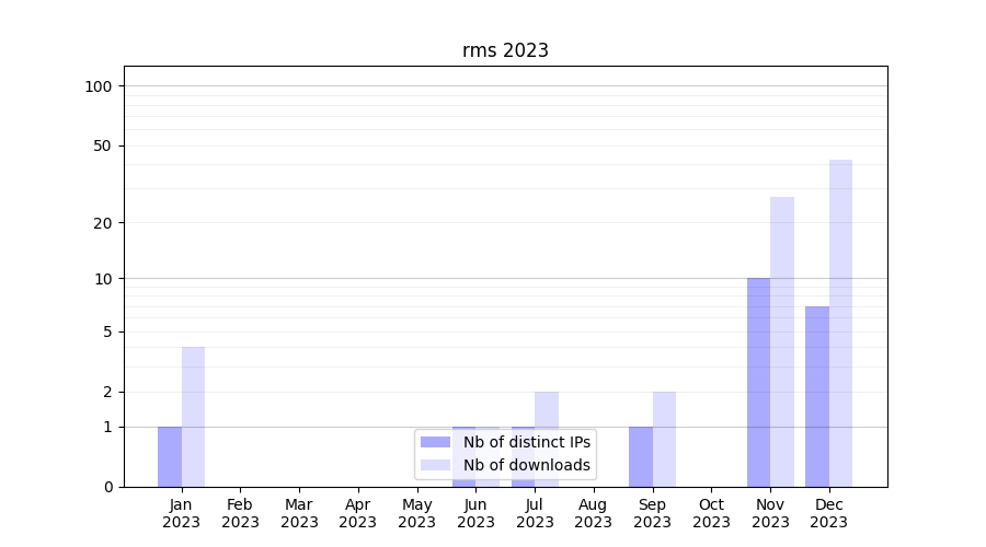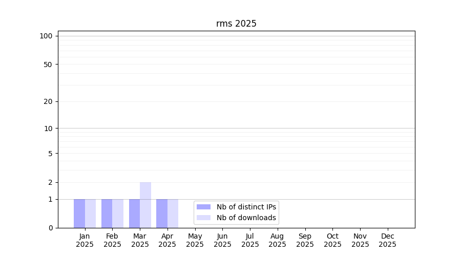 Number of downloads for workflow package rms, year by year, from 2025 back to 2015 (years with no downloads are omitted):