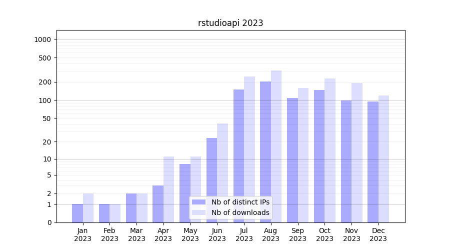 Number of downloads for workflow package rstudioapi, year by year, from 2025 back to 2015 (years with no downloads are omitted):