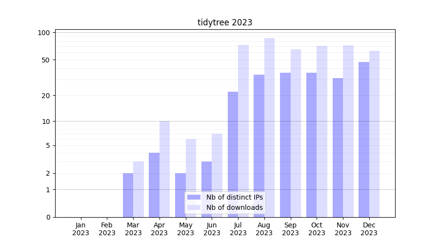 Number of downloads for workflow package tidytree, year by year, from 2025 back to 2015 (years with no downloads are omitted):