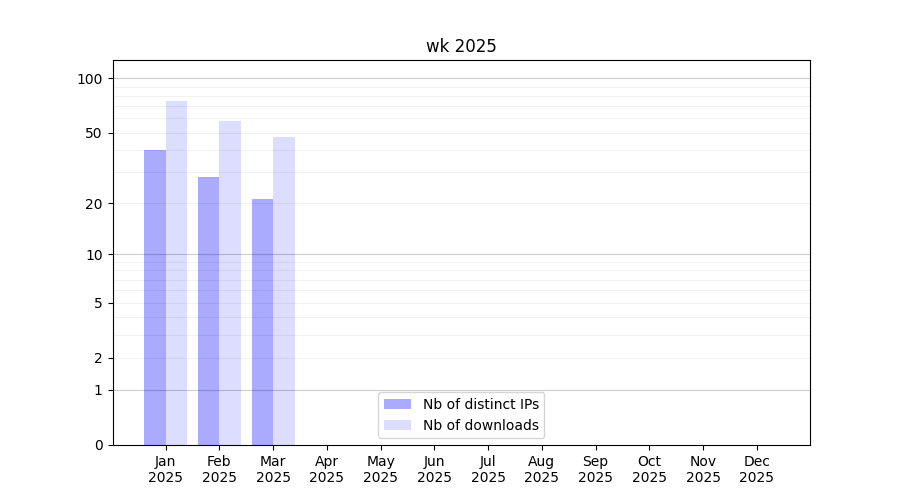 Number of downloads for workflow package wk, year by year, from 2025 back to 2015 (years with no downloads are omitted):