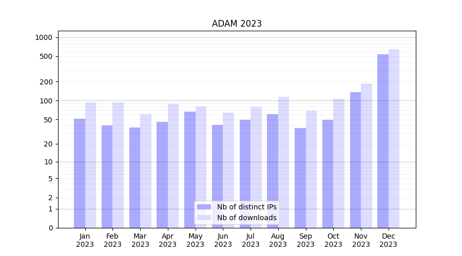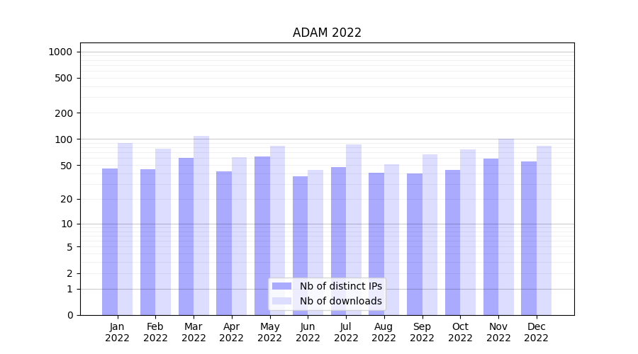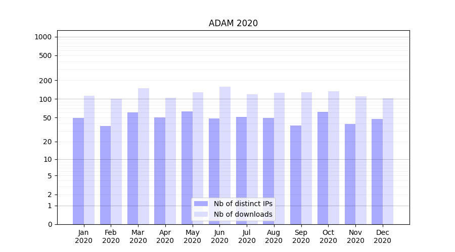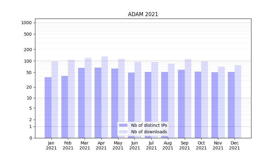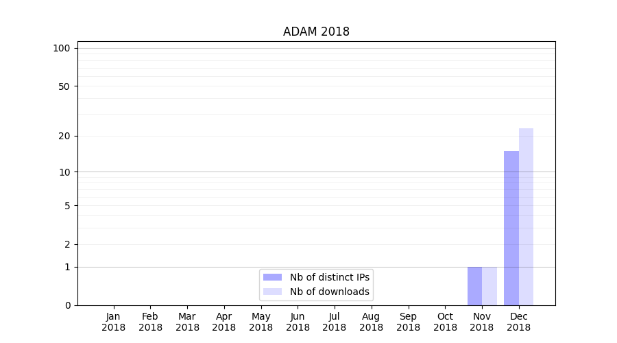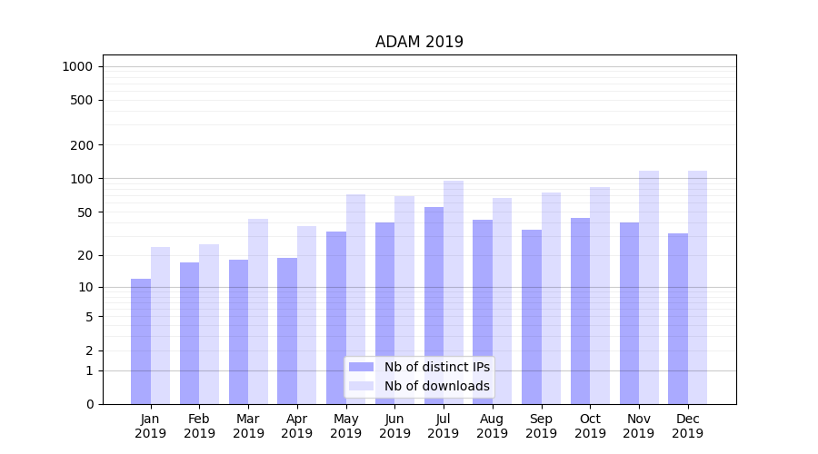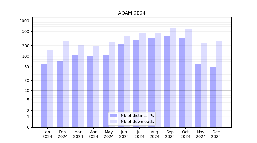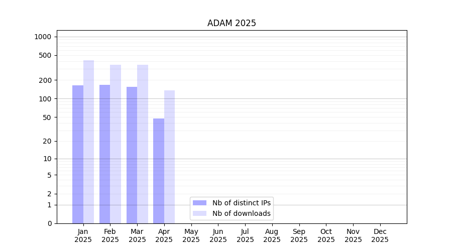 Number of downloads for software package ADAM, year by year, from 2025 back to 2014 (years with no downloads are omitted):