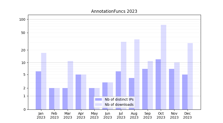 Number of downloads for software package AnnotationFuncs, year by year, from 2025 back to 2014 (years with no downloads are omitted):