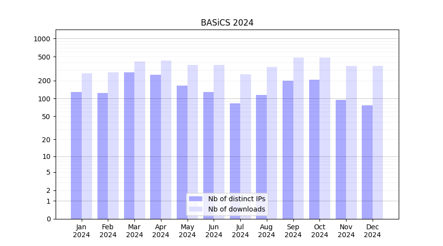 Number of downloads for software package BASiCS, year by year, from 2025 back to 2014 (years with no downloads are omitted):