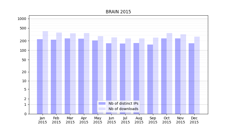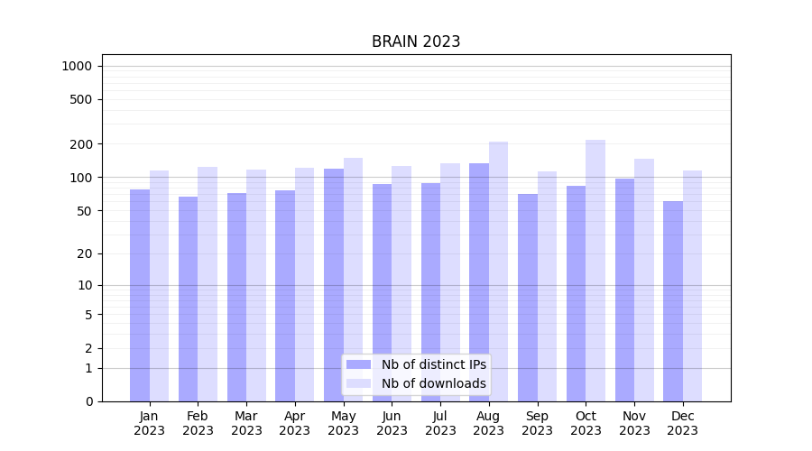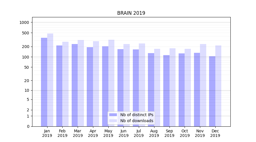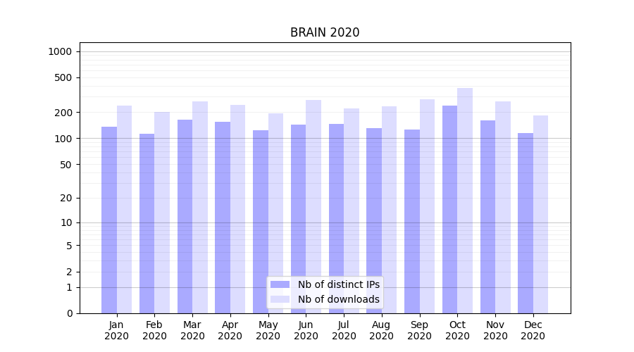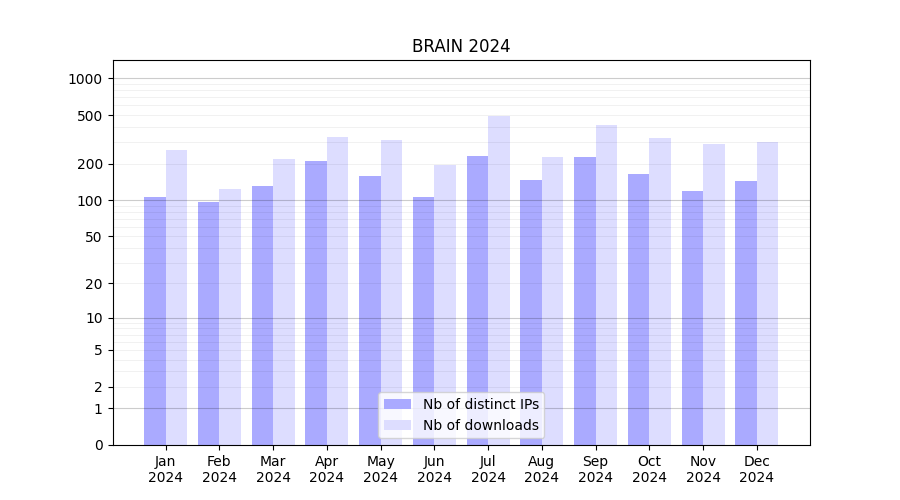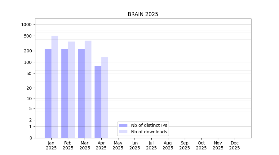 Number of downloads for software package BRAIN, year by year, from 2025 back to 2014 (years with no downloads are omitted):