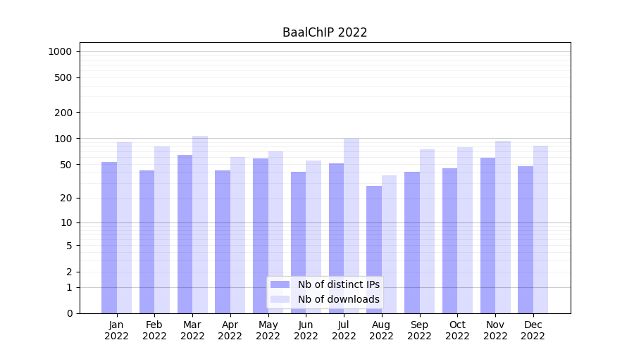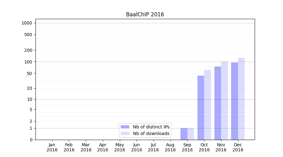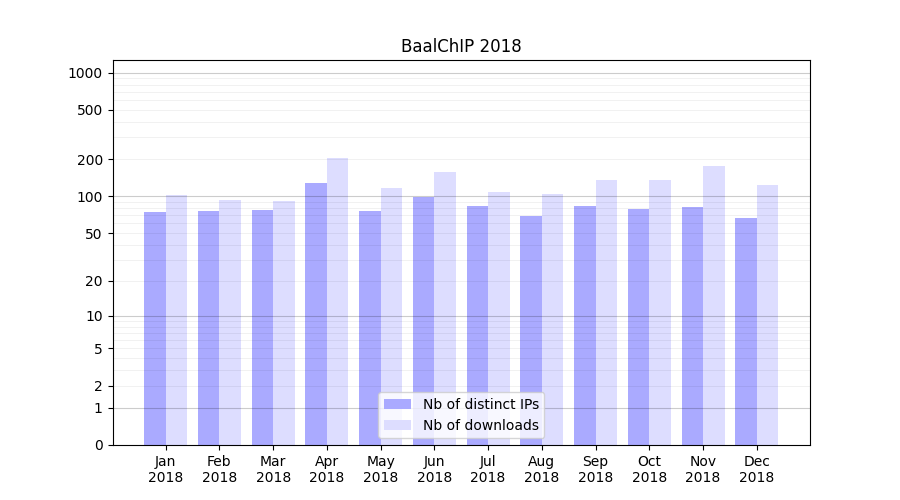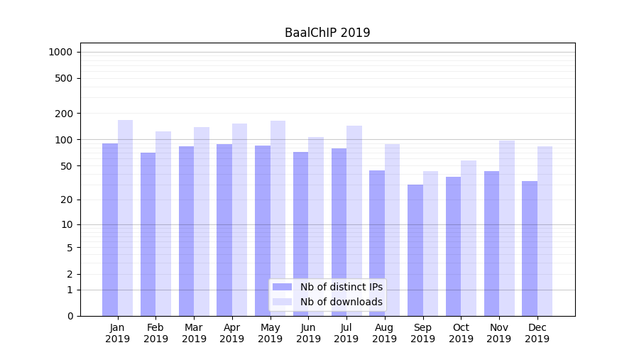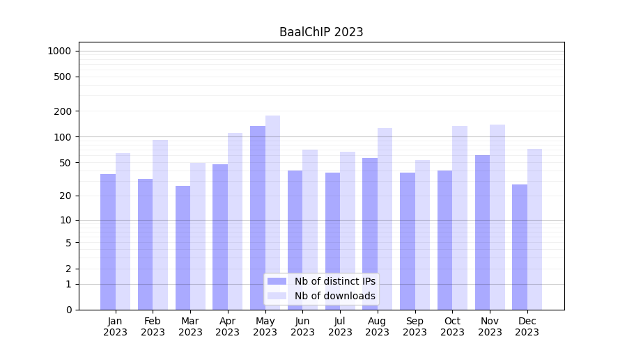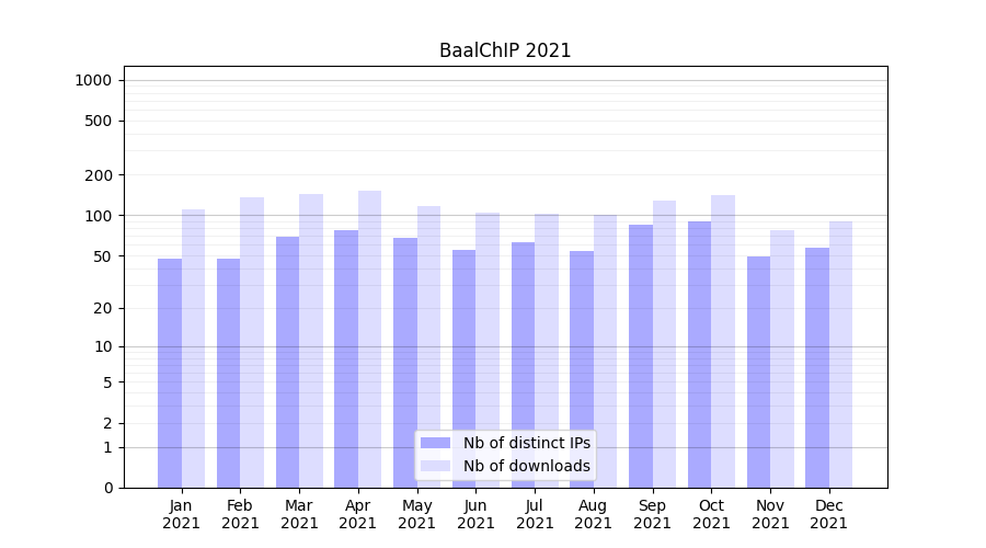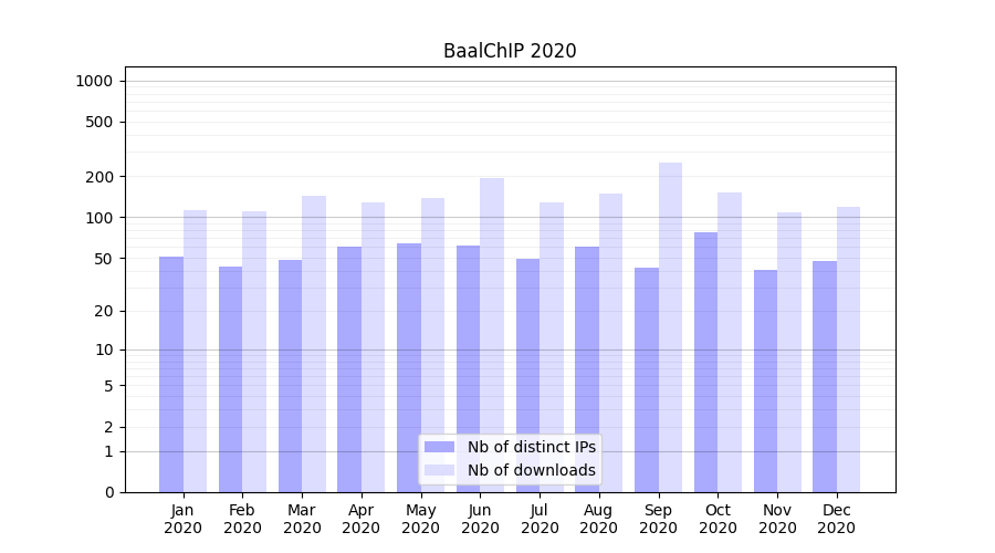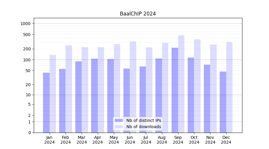 Number of downloads for software package BaalChIP, year by year, from 2025 back to 2014 (years with no downloads are omitted):